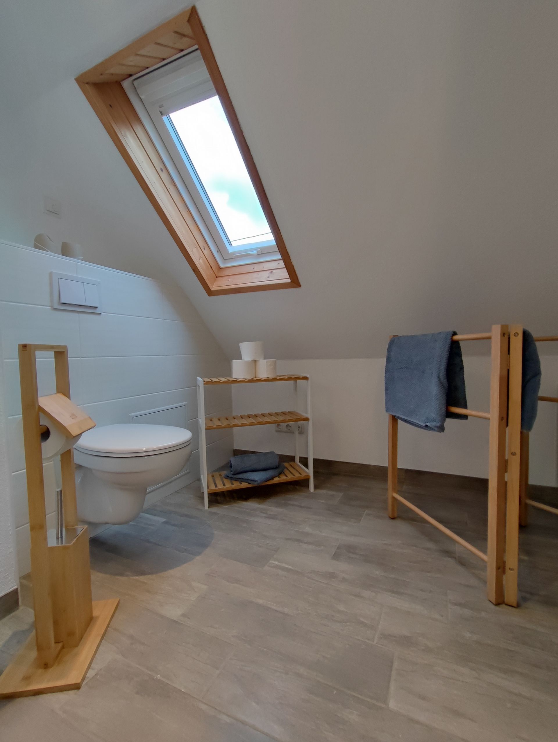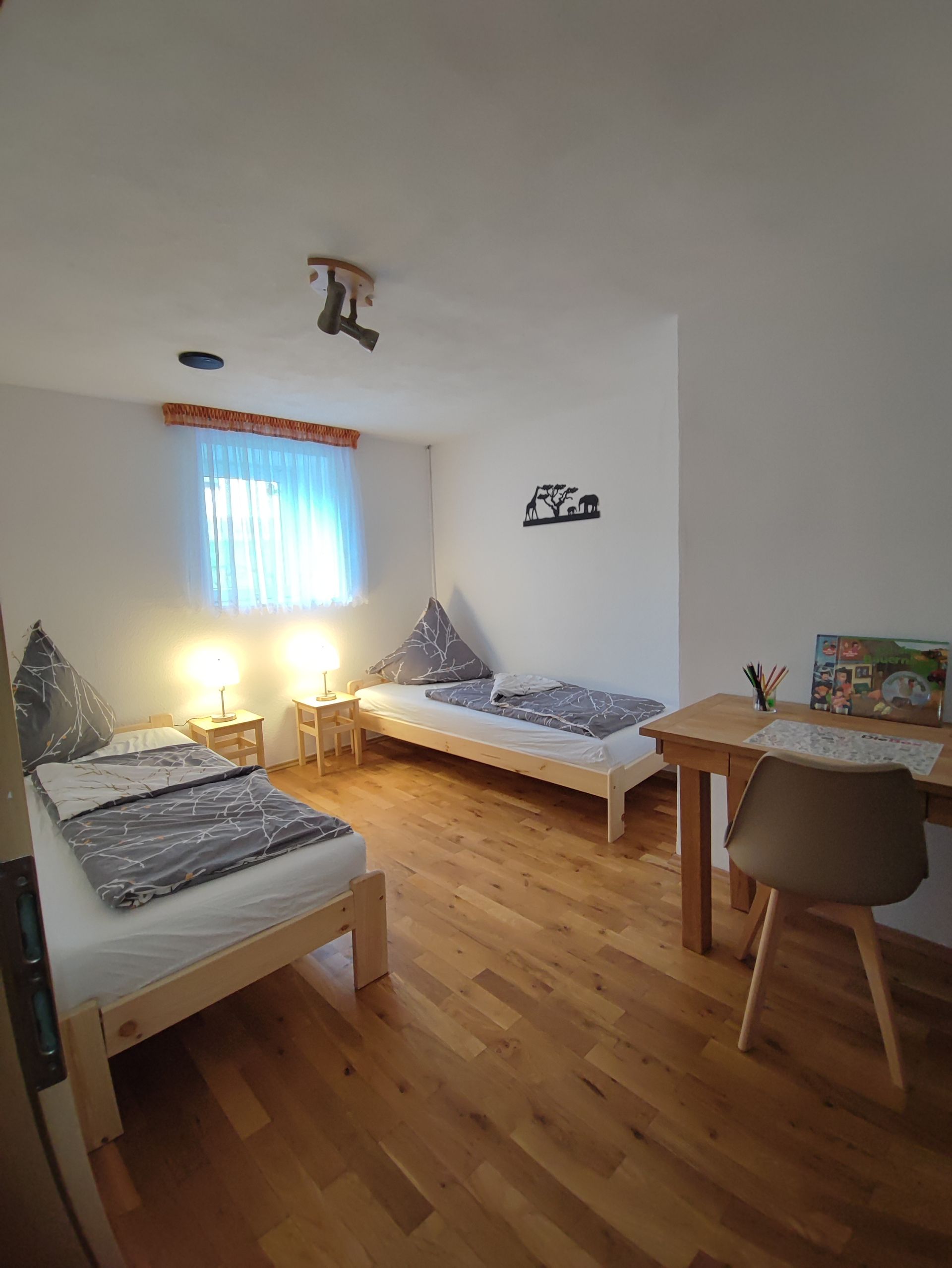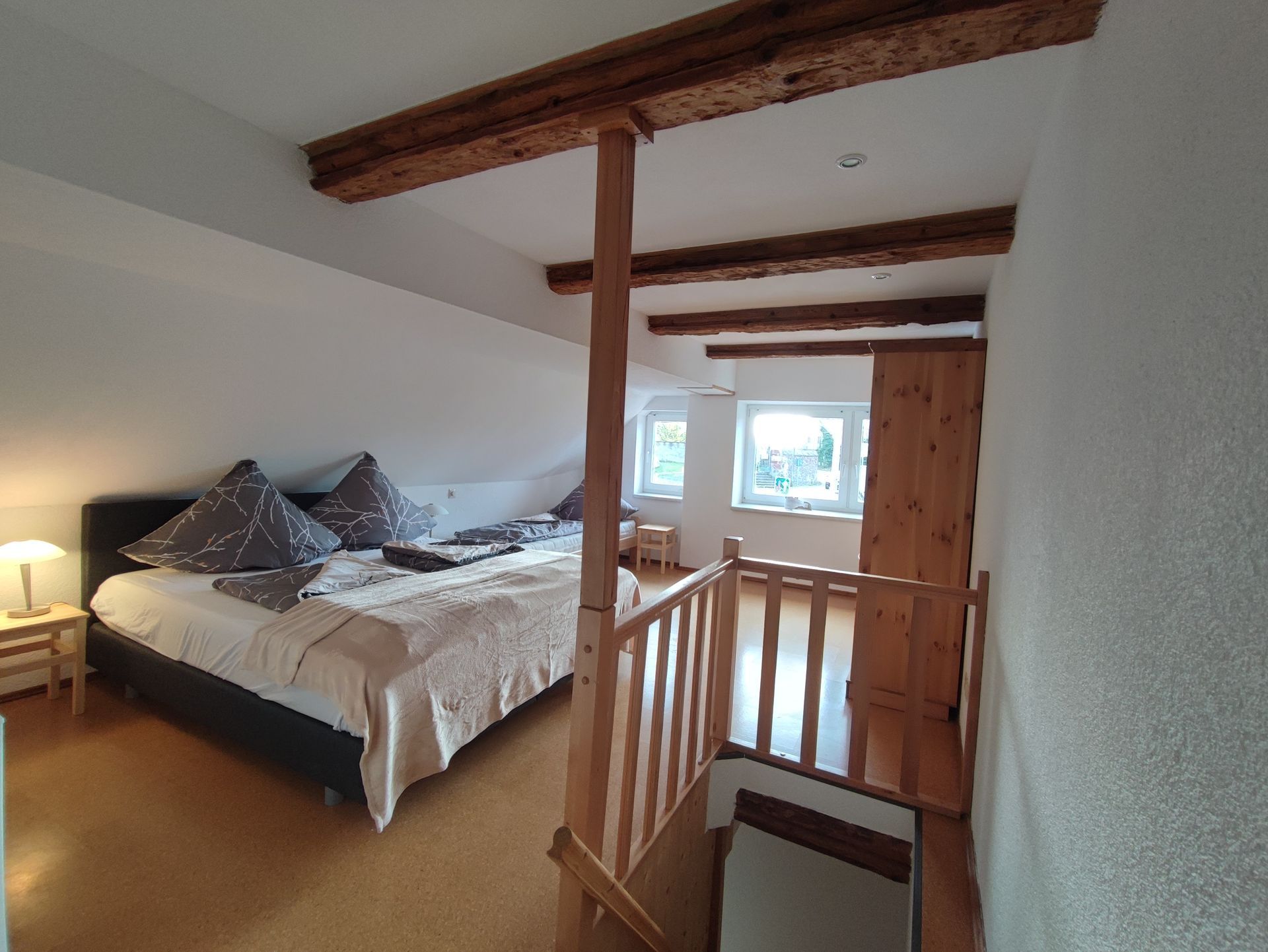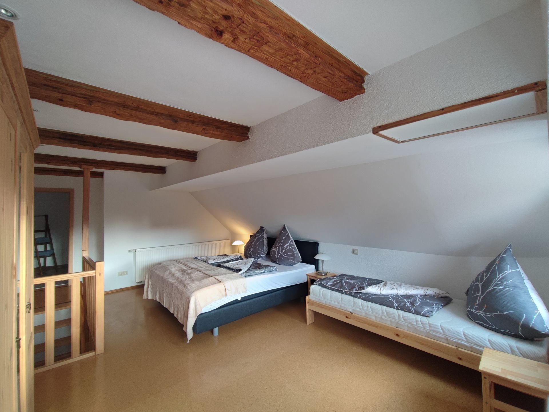 Im Obergeschoss erwartet Sie das (Eltern)-Schlafzimmer mit einem Boxspringbett (180 x 200 cm) und ein Einzelbett (80x200 cm) sowie ein geräumiges Badezimmer mit WC und Dusche.